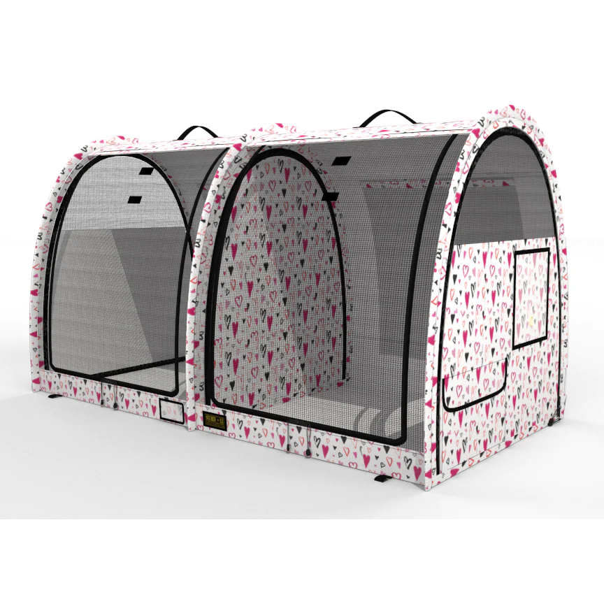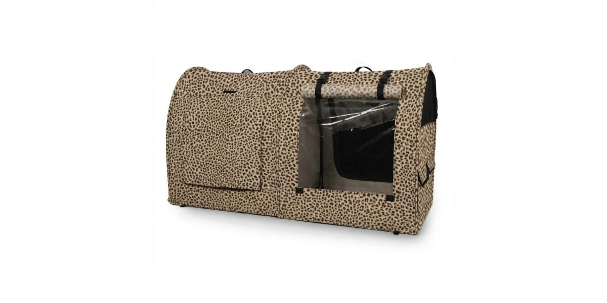 LE Pop-Up Kennel – Large, Double, Euro Back (aka Habitat) now in Limited Edition Prints! This is our largest Kennel. Euro Back refers to the large clear vinyl windows on the back of the shelter with retractable privacy flaps. No assembly is required. Simply remove from case, give it a shake and pop it open! Mesh doors for maximum ventilation. Great for use at home, in hotels and on the road. (Comfort pads and other accessories that appear in some photos are sold separately.) Double Kennels can be used as two separate compartments or zip down the center divider for one large enclosure.